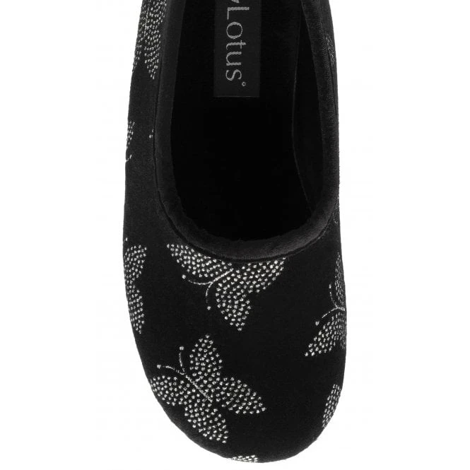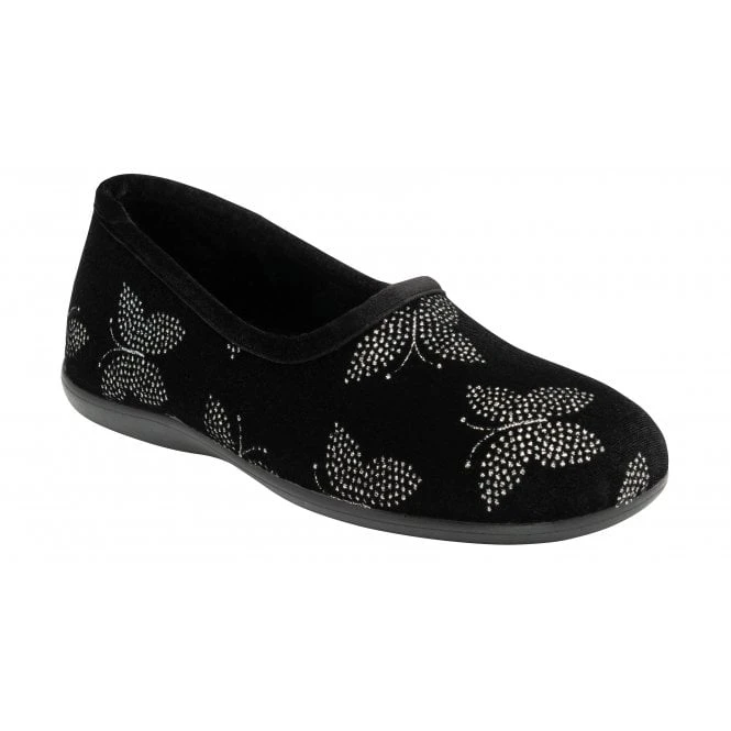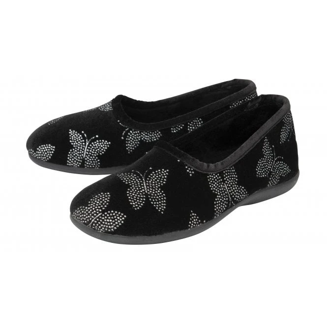 The stunning Lotus Jessie slippers are perfect for adding a touch of sparkle to your loungewear looks. Crafted in a soft velour and featuring feminine glitter butterflies, this women’s black full shoe slipper has a striking aesthetic that oozes appeal. Optimal comfort is also delivered through the incorporation of memory foam in-socks, whilst the rubber outsoles enhance durability.