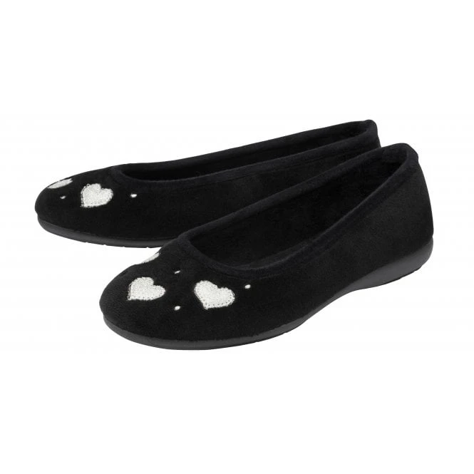 Giving the black ballerina slipper Lois a delightful finishing touch are cute glitter love hearts and metallic embroidered spots. Crafted with a soft touch textile upper and lining, plus a rubber outsole for enhanced durability, this Lotus women’s full shoe slipper is as practical as it is stylish.