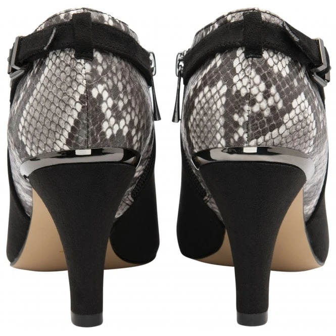 A stylish offering that is exceptionally wearable is the Lotus Ramona shoe-boot. This Lotus women’s black shoe-boot that rests on a 8.5cm heel features a sumptuous textile upper, plus a snake printed heel counter that is further accentuated by a decorative buckle strap. This Lotus ladies’ shoe-boot that is crafted with an almond pointed toe will add the perfect finish to tailored looks.