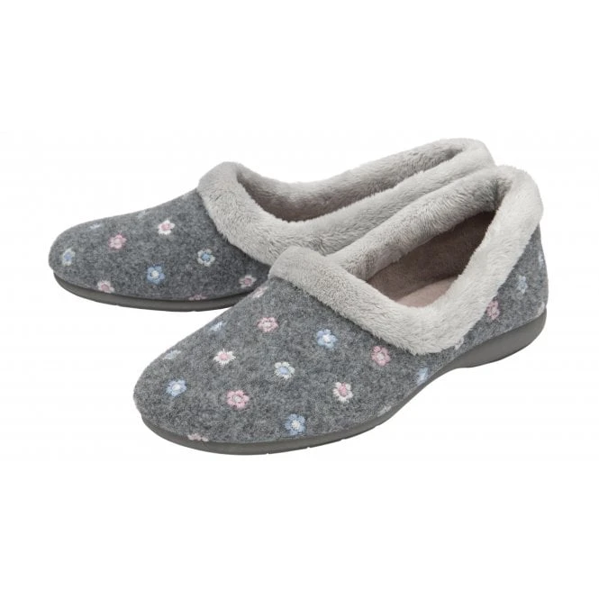 A multitude of stitched ditsy flowers in pastel colours grace the textile upper of the Lotus Kylie slipper. This women’s grey full shoe slipper also boasts a sumptuous faux fur collar and an incredibly soft lining that provide additional warmth in the colder months. This Lotus ladies’ slipper is highly wearable due to the cushioned insock, whilst the flexible hard outsole also makes the Lotus Kylie slipper extremely practical too.