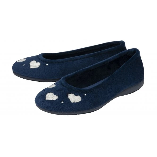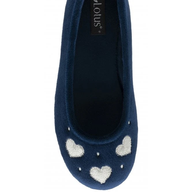 Giving the navy ballerina slipper Lois a delightful finishing touch are cute glitter love hearts and metallic embroidered spots. Crafted with a soft touch textile upper and lining, plus a rubber outsole for enhanced durability, this Lotus women’s full shoe slipper is as practical as it is stylish.