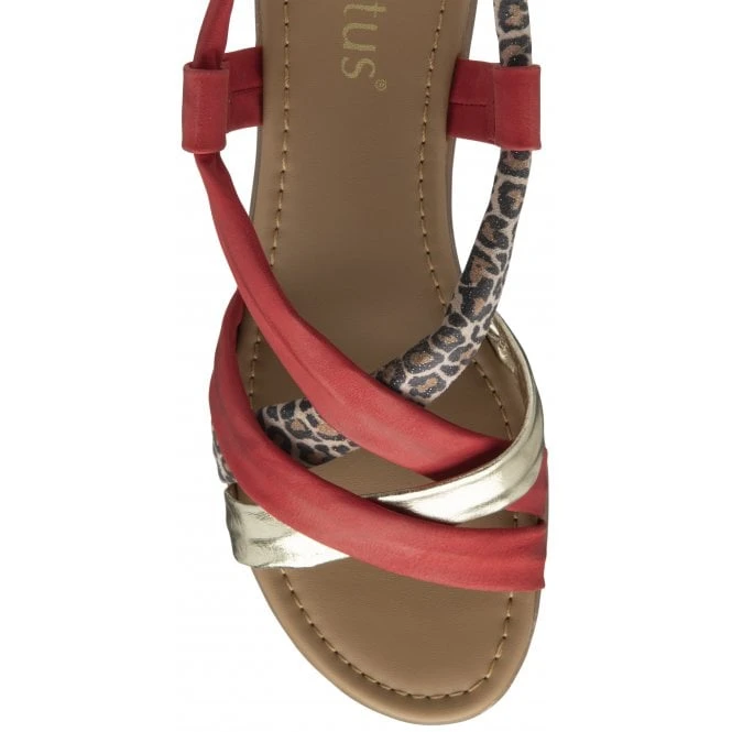 Highly distinctive, the Lotus Christa sandal will quickly become a go-to footwear option! Red, gold and an eye-catching leopard print have been encapsulated on the sumptuous leather straps that entwine and unite with an elasticated slingback. This striking open toe women’s sandal also sits on a wearable 3cm wedge heel and boasts a ridged finished sole unit. Christa is certainly easy to wear and just as easy to style.