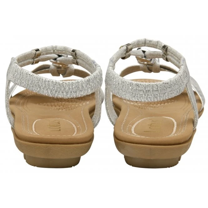 The women’s Lotus Bettina sandal is highly distinctive, exceptionally comfortable and promises 24/7 style on holiday! Enhancing the upper of this flat, open toe, silver sandal is polished metal hardware and imitation crystals. Comfort is amplified by the incorporation of a cushioned insock and an elasticated slingback.