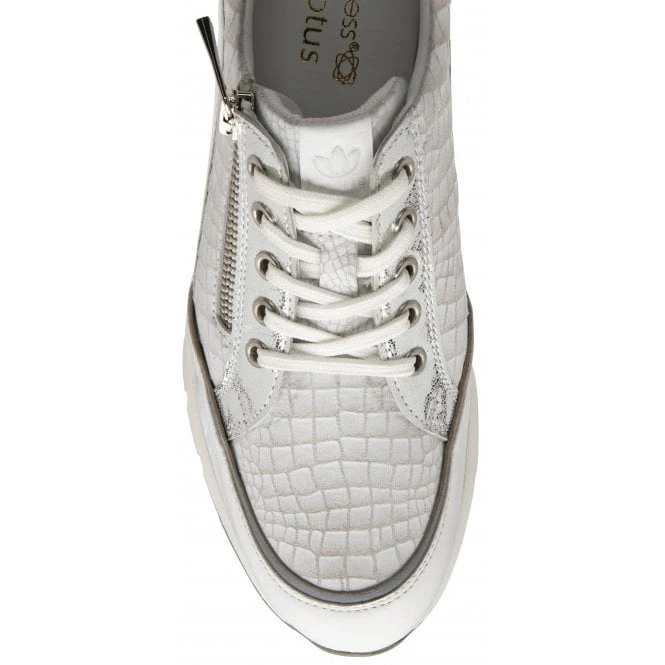 The Stressless by Lotus Sanford trainer will certainly give your friends shoe envy, not only because it looks great but because it is exceptionally comfortable too! This striking white lace-up sneaker is crafted from premium leather and boasts mock croc printed panels, metallic trims, an exposed zip and a crisp white 4.5cm wedge heel. Comfort is addressed by the inclusion of a padded ankle collar and shock absorbing properties have been incorporated within the cushioned insock. This Stressless by Lotus women’s trainer is highly wearable, superbly versatile and a must-have for any fashion minded individual!