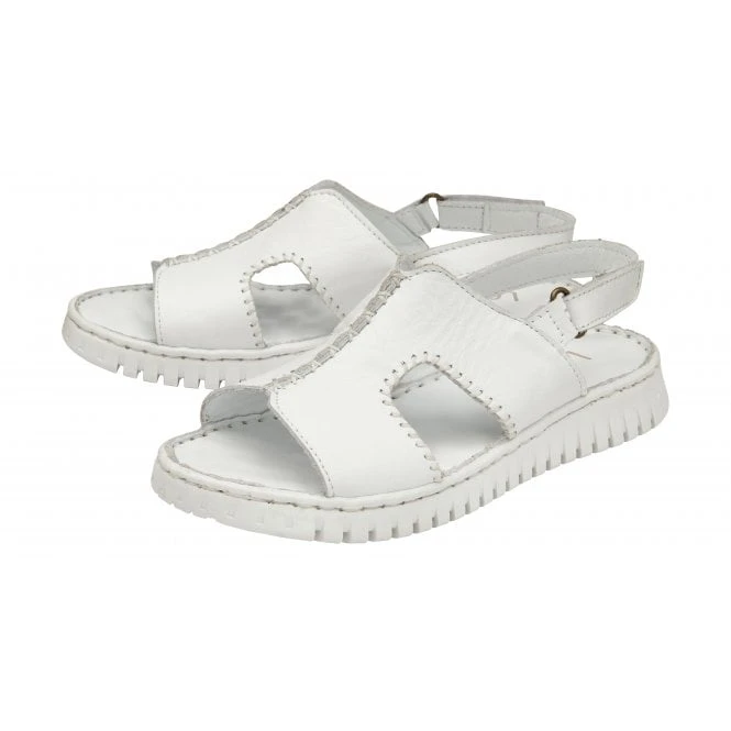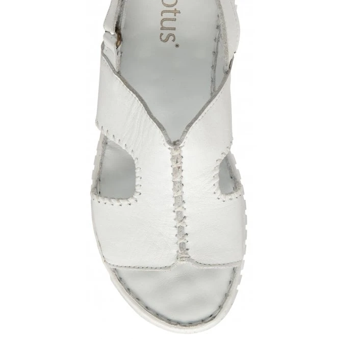 The Lotus Astrid open toe sandal is a delight to wear due to the comfort attributes that have been incorporated. This women’s white sandal is crafted with an incredibly soft leather upper that is subtly enhanced by cut out panels that are finished with decorative blanket stitching. This almost flat Lotus sandal also boasts a leather lining, a cushioned footbed and an adjustable rip-tape slingback.
